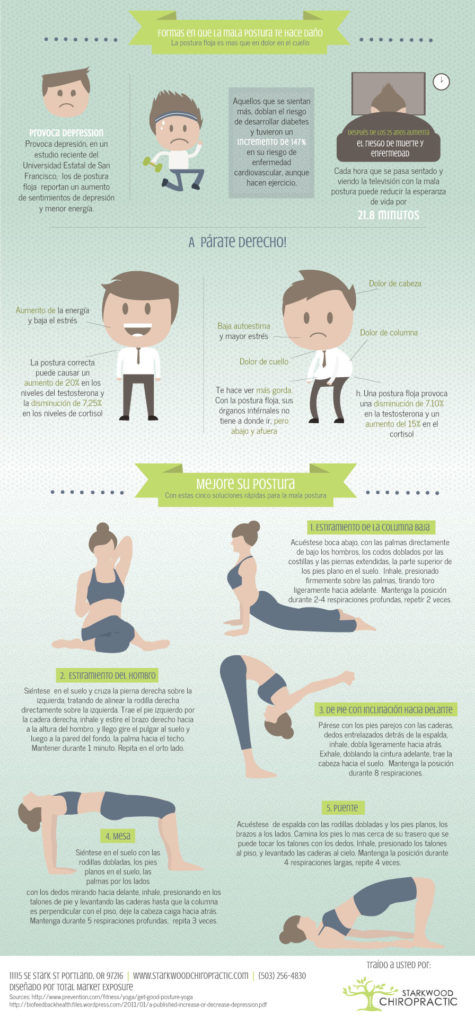 Un estudio reciente de la Universidad Estatal de San Francisco muestra la mala postura puede causar depresión y los niveles de energía más bajos que los que están de pie en posición vertical. Una postura floja se demostró que causaba una disminución media de los niveles de testosterona de 7,10 % y un aumento del 15 % en los niveles de cortisol. El cortisol es una hormona que hace que su nivel de estrés para aumentar, por lo que tener un nivel de cortisol más altos que los medios normales que estás constantemente bajo estrés excesivo como resultado de encorvarse. Trabajar para mejorar su postura puede resultar en un aumento de hasta 20% en sus niveles de testosterona y una disminución significativa de cortisol, lo que resulta en más energía y menos estrés.